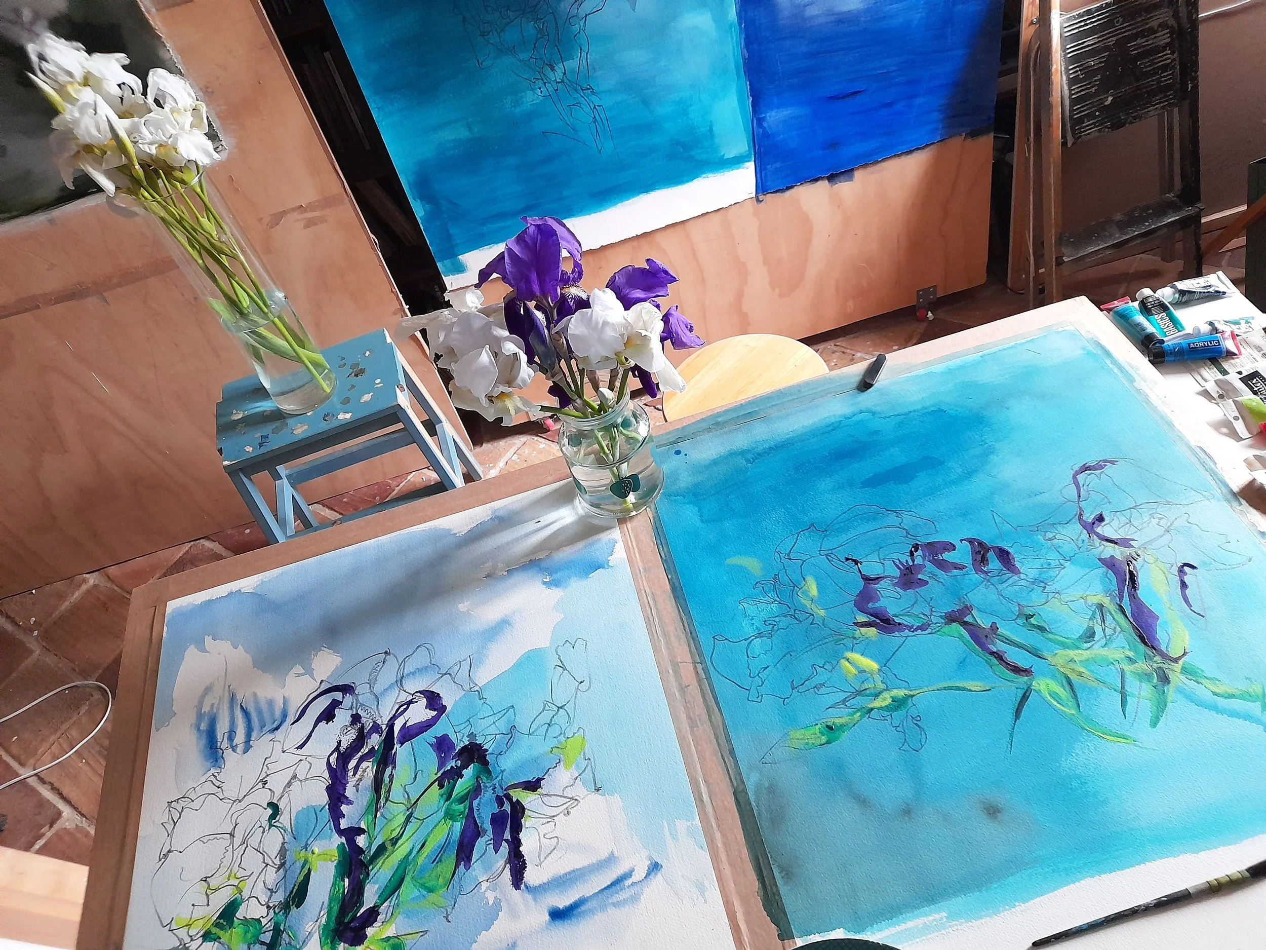 From poised purple-tipped silence, May 2023, watercolour, acrylic, pastel & pencil on Heritage 300gm NOT surface 100% cotton paper, 70x70cm, £395